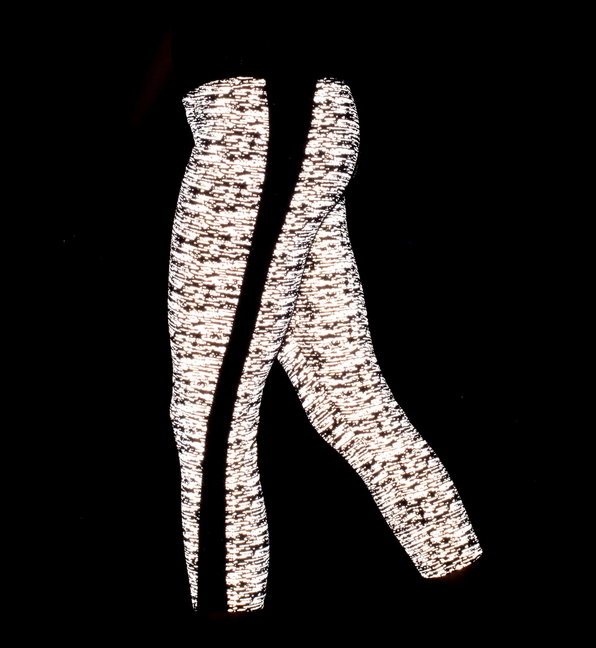 Reflective lycra during the day is a black and grey color at night, it gives ‘astonishing reflectivity’.